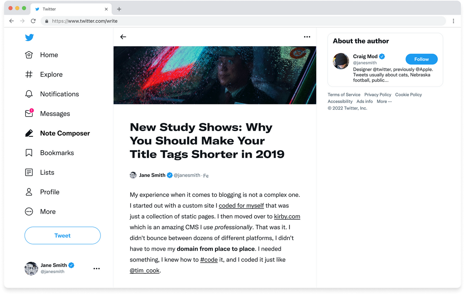 I led the effort to design and ship Twitter Notes, a new 0-1 product that allowed writers to compose and publish articles, journals, blogs, and essays directly on twitter.com, free of charge